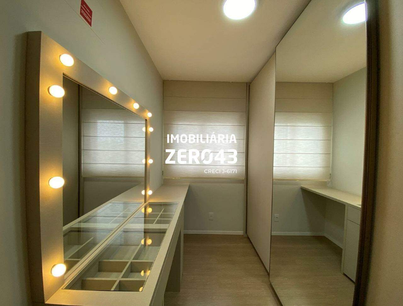 - Quarto com closet e bancada para home office com penteadeira iluminada.